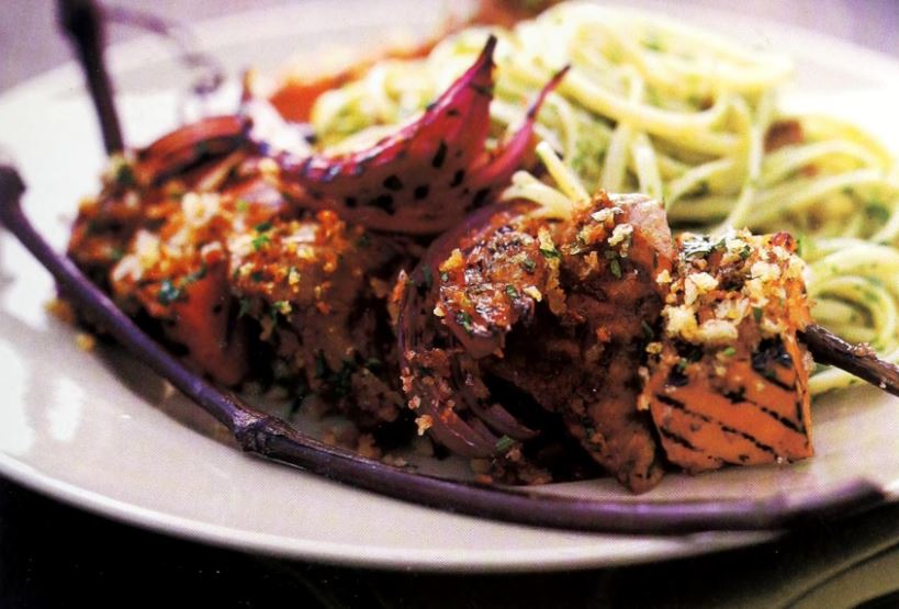 Grilled Veal, Sweet Potato, and Red Onion Kebabs in the Piccata Style