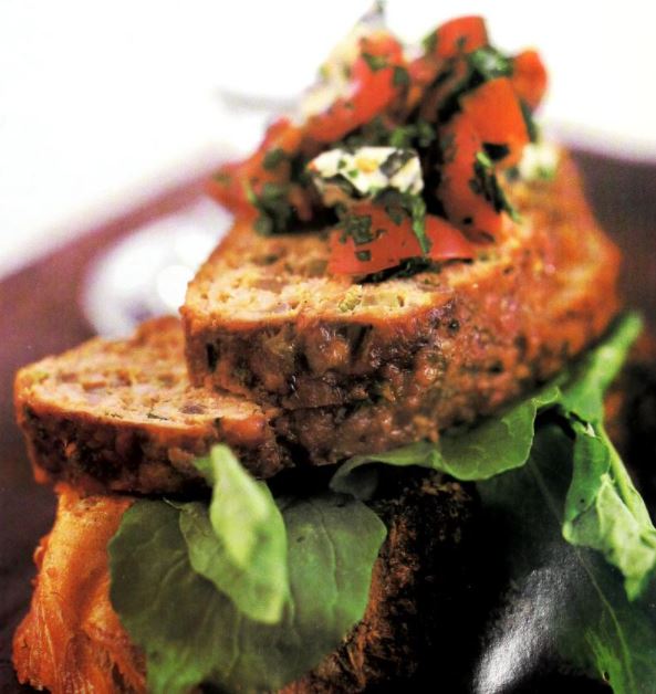 A Hot Open Faced Veal Meat Loaf Sandwich with Arugula and Blue Cheese – Tomato Relish
