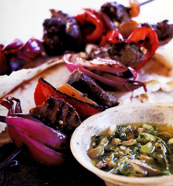 Broiled Sherried Lamb Skewers with Dried Apricots and Green Olive Dressing