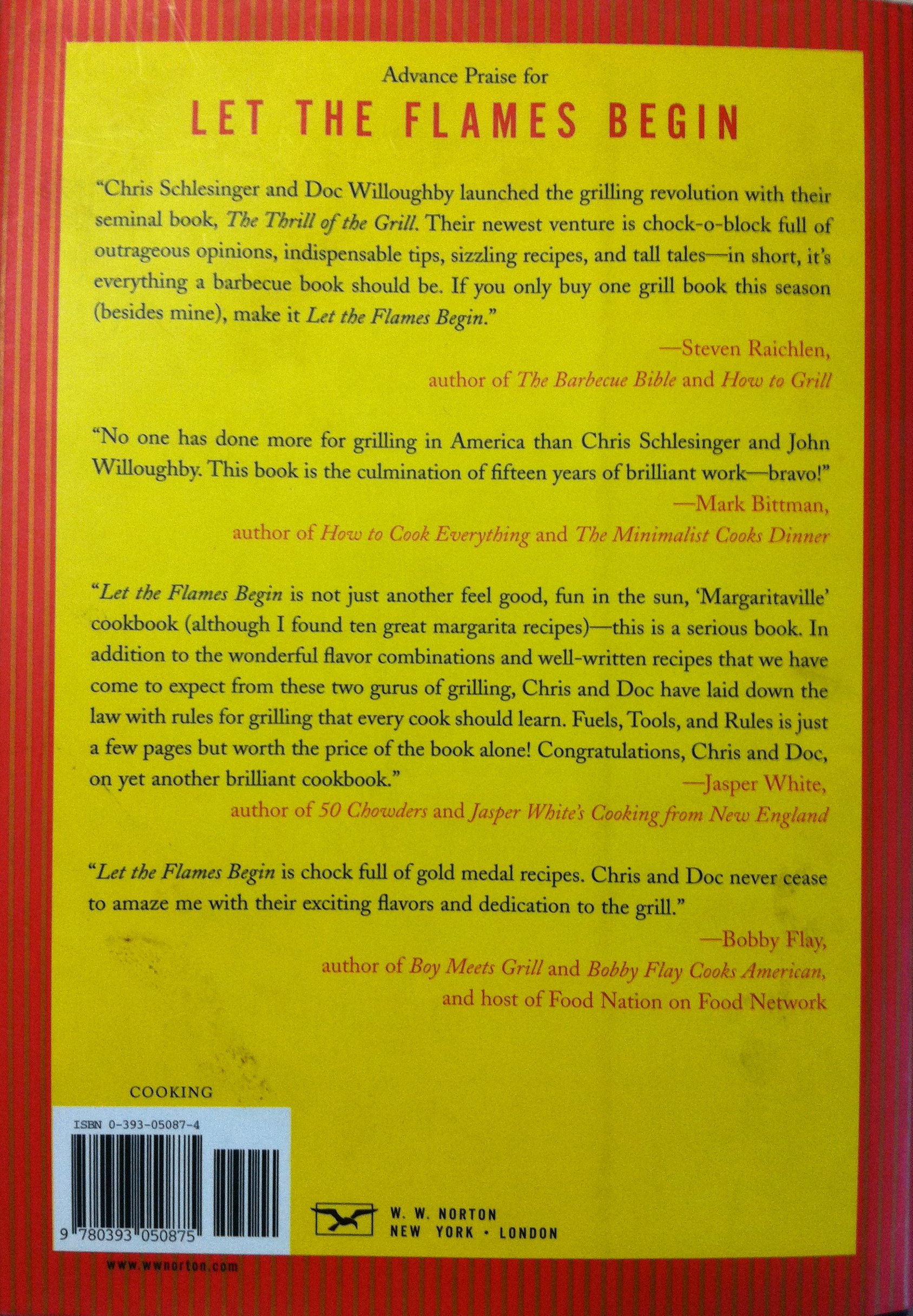 That is to say, I discovered that my dad did not invent grilling. I learned that it, along with braising, sautéing, and so on, is a bona fide cooking method, with practices and procedures laid our by Escoffier and other great experts of Western cooking, and I realized that grilling too is governed by traditional culinary laws. I already knew, for example, that there are right and wrong ways of sautéing and braising, that you need to get the fat in the pan very hot to sauté properly, and that your braise does not come out right if you let the liquid boil rather than simmer. I had also learned, through endless trial-and-error experiences, that these dynamics, rules, and principles went a long way toward dictating the quality of the outcome. Now I understood that the same was true of grilling. So to my formidable base in the goodwill alacrity approach to grilling, I added another paradigm: the classic French technical approach.