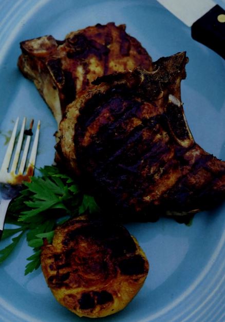 Grilled Double Thick Pork Chops with Grilled Peaches and Molasses – Rum Barbecue Sauce