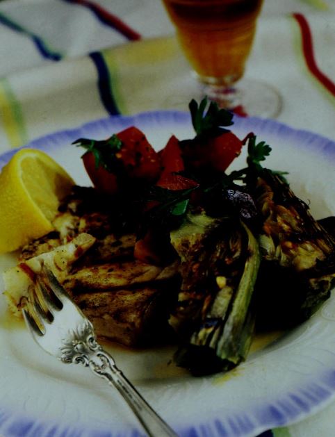 Grilled Swordfish with Artichokes, Tomatoes, and Olives