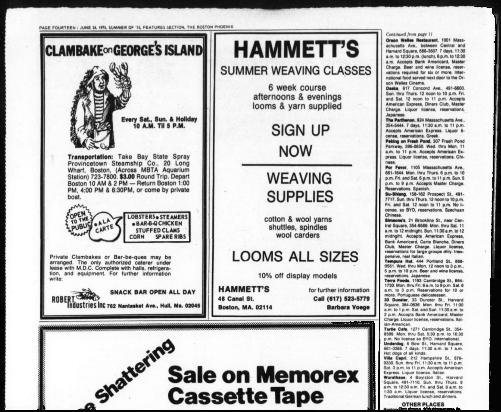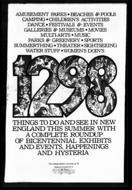 -Excerpt and images courtesy of The Internet Archive, Kahle / Austin Foundation, The Boston Phoenix 1975-06-24: Vol 4 Supplement, “1298 Things To Do and See In New England This Summer With A Complete Roundup Of Bicentennial Exhibits And Events, Happenings and Hysteria,” by the Boston Phoenix, June 24, 1975