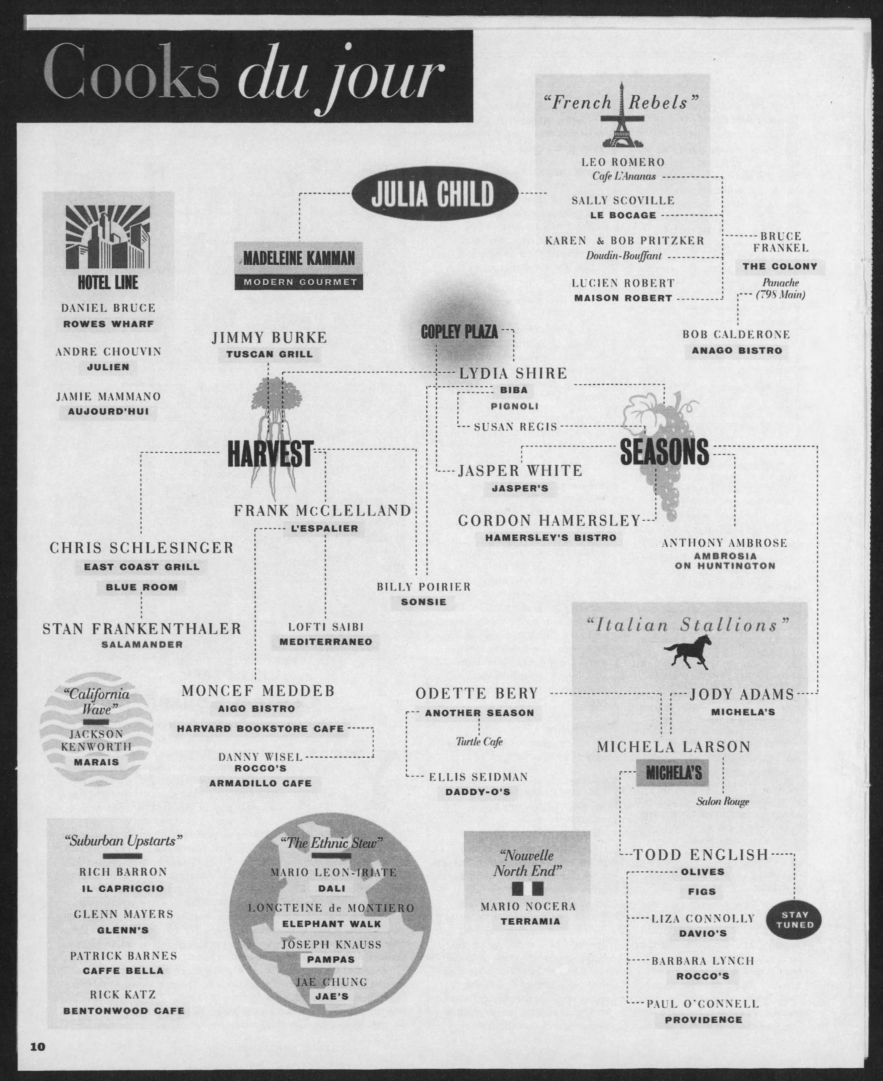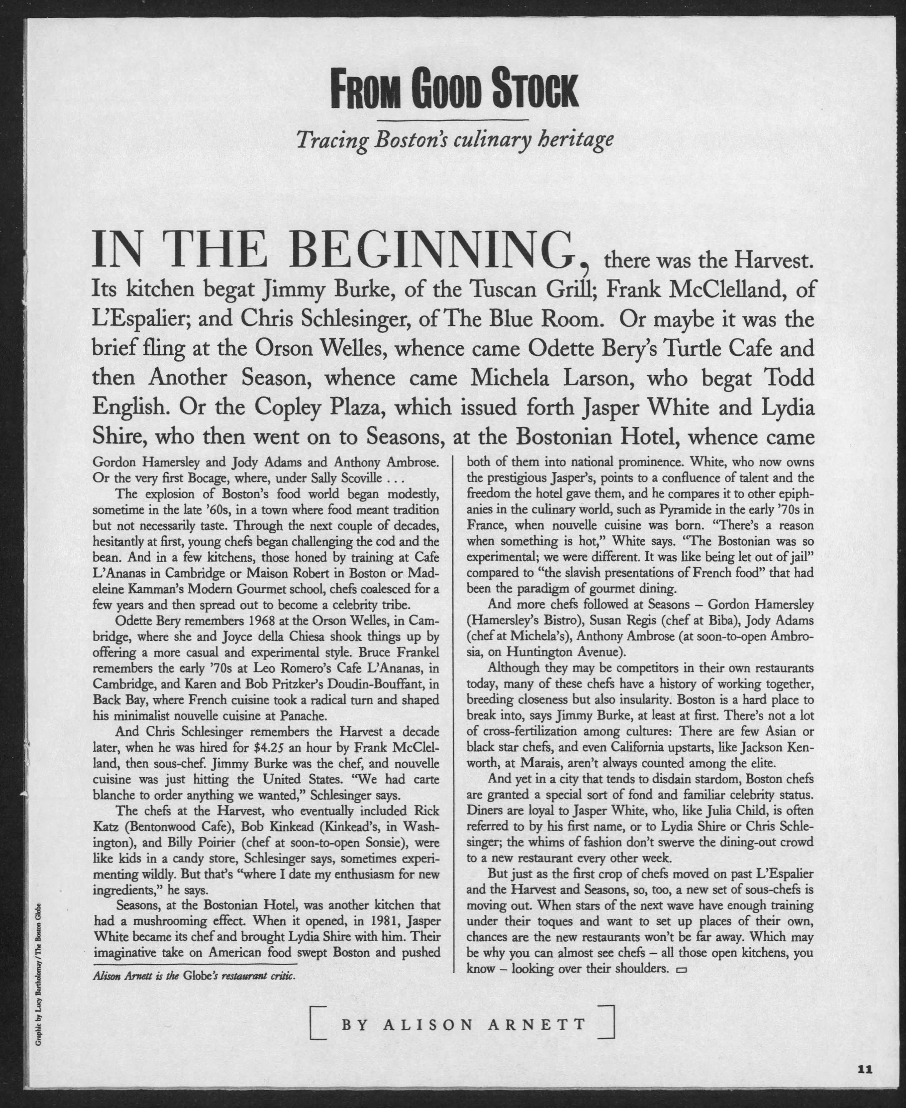 “IN THE BEGINNING there was the Harvest. Its kitchen begat Jimmy Burke, of the Tuscan Grill; Frank McClelland, of L’Espalier; and Chris Schlesinger, of The Blue Room. Or maybe it was the brief fling at the Orson Welles, whence came Odette Bery’s Turtle Cafe and then Another Season, whence came Michela Larson, who begat Todd English. Or the Copley Plaza, which issued forth Jasper White and Lydia Shire, who then went on to Seasons, at the Bostonian Hotel, whence came Gordon Hamersley and Jody Adams and Anthony Ambrose. Or the very first Bocage, where, under Sally Scoville…
