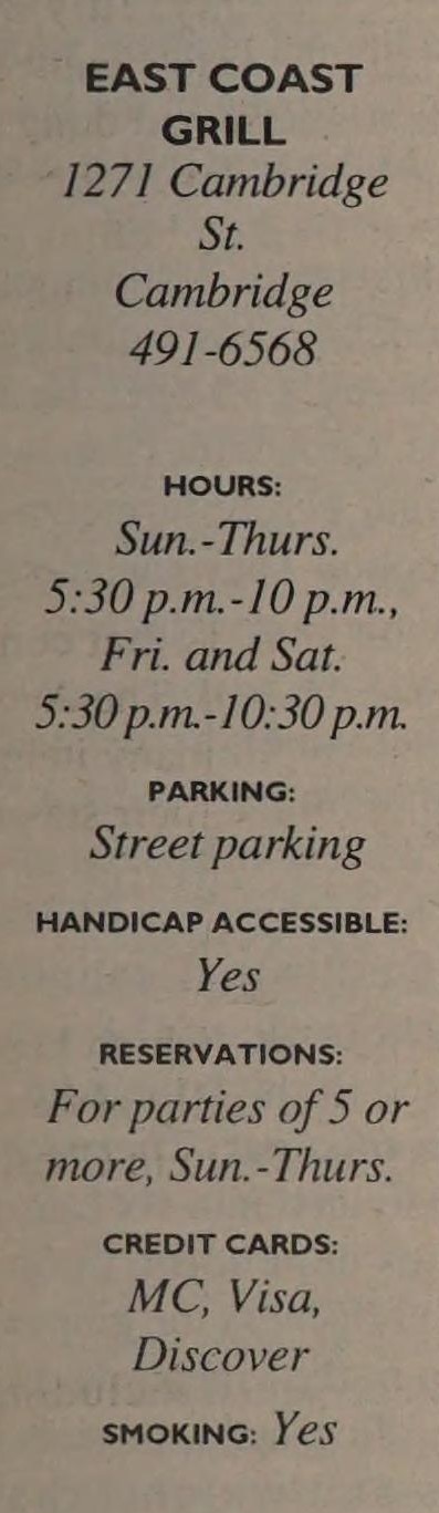 I should point out that an appetizer of Corn Crusted Grilled Shrimp ($7.25) was chewy, even with a tasty Caribbean salsa on the side. Other than that, though, I’d say Boston’s lucky to have such a place as East Coast Grill.