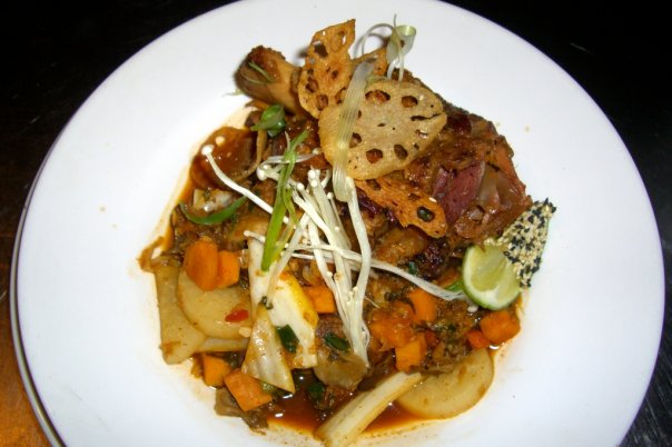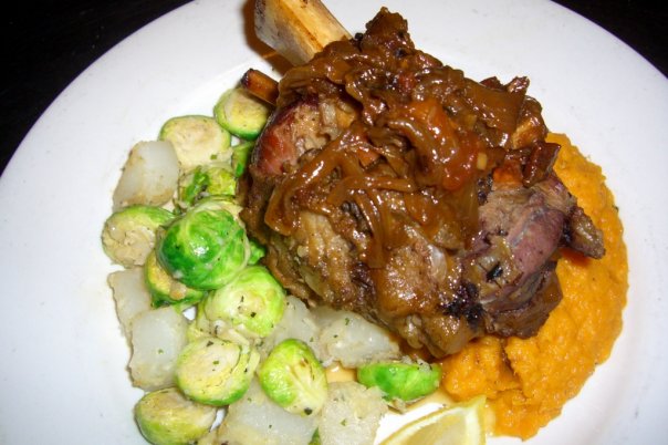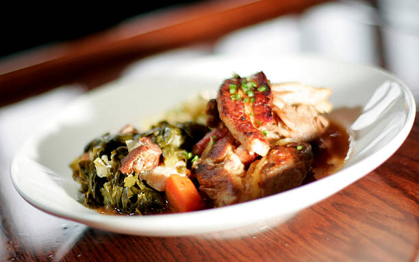 February 26, 2008 — A braised pork shoulder and bacon, with collard greens and creamy polenta, at Highland Kitchen. (Photo by David Kamerman/The Boston Globe via Getty Images)