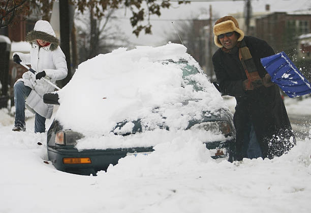December 16, 2007 — Near Inman Square Klara Seiger, left, of Concord and Nat Bala of Cambridge, work to dig out Seiger’s car from the night’s massive snow dump. (Photo by Dina Rudick/The Boston Globe via Getty Images)