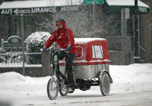 January 28, 2009 — A restaurant delivery driver works his way through Inman Square during a snowstorm. (Photo by Mark Garfinkel/MediaNews Group/Boston Herald via Getty Images)