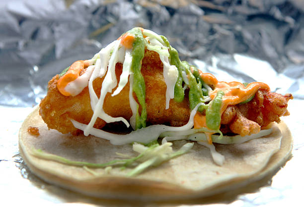 August 8, 2008 — Baja taco from Olecito in Inman Square features battered shrimp, pickled cabbage, chipotle mayonnaise and cilantro pesto. (Photo by Wendy Maeda/The Boston Globe via Getty Images)