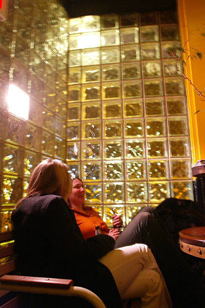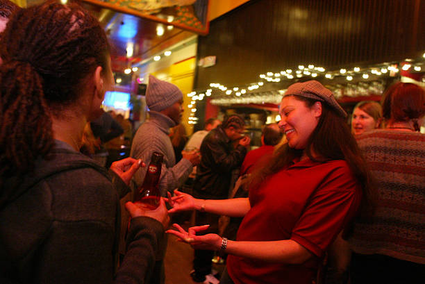 August 3, 2000 — Amanda Nask, center, and Claudia DeHaven Biddle, right, bottom, enjoying a raining summer night indoors, with friends at the Abbey Lounge in Inman Square. (Photo by Dominic Chavez/The Boston Globe via Getty Images)