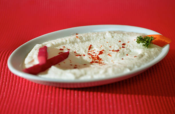 March 12, 2003 —Whipped garlic spread from the Middle East restaurant in Cambridge, Mass. (Photo by Wendy Maeda/The Boston Globe via Getty Images)