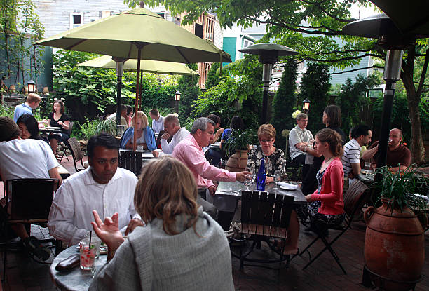 July 11, 2009 — People eat dinner on the outside patio at Oleana restaurant. (Photo by Maisie Crow for The Boston Globe via Getty Images)