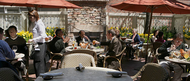 April 16, 2008 — Olga Medvedev, left, serves Sam Levey and Reed Lowrie in the open patio at the Harvest restaurant. (Photo by Dominic Chavez/The Boston Globe via Getty Images)