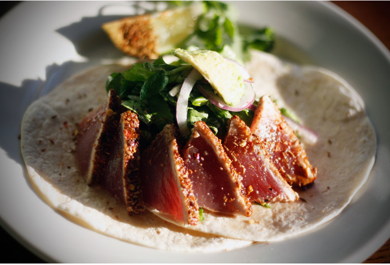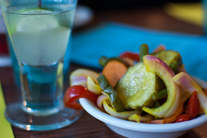 November 17, 2011 — Menu item pictured is: “Duck, Duck Chicken” (slow-roasted duck, chicken liver & fig pate, mushroom ragout, arugula, grapefruit vinaigrette) for $12.99, “Sassy Pita Chips” for $1.99 with “Pinarita” cocktail for $9.00. (Photo by Pat Greenhouse/The Boston Globe via Getty Images)