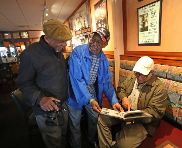 October 3, 2018 — From left, Alan Jackman, Narvos Stamps and Bob Hawkins look over a 1960 yearbook. (Photo by David L. Ryan/The Boston Globe via Getty Images)