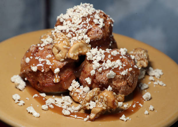 July 30, 2019 — Turkish-style profiteroles with sesame caramel, cashew and halva at Oleana. (Photo by Matthew J. Lee/The Boston Globe via Getty Images)