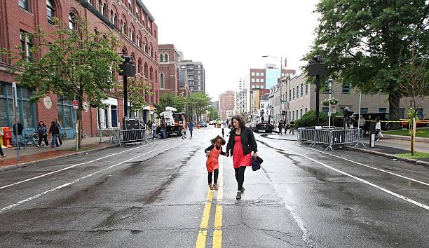June 24, 2011 — Caren Irr, and her daughter, Lonso Irr, right, 5, both of Cambridge, dance down the center of Massachusetts Avenue as the Cambridge Dance Party starts off Friday at the intersection Massachusetts Avenue and Inman Street in Cambridge, Mass. The dance is organized by the City of Cambridge, and lasts from 7 to 11 p.m. (Photo by Jessey Dearing for The Boston Globe via Getty Images)