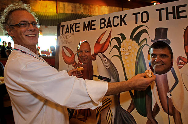 May 24, 2010 — Chef and owner Jasper White feeds lobster rolls to Chris Schlesinger, chef at East Coast Grill, center, and Patrick Lyons, White’s business partner at Summer Shack, during the Summer Shack 10th Anniversary Party. (Photo by Matthew J. Lee/The Boston Globe via Getty Images)