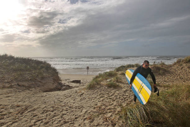 October 30, 2012 — Surfer Jerry Kirohn, from Stoughton, brought his surfboard to Horseneck Beach in Westport but did not surf because the conditions were too rough in the aftermath of Hurricane Sandy. (Photo by David L. Ryan/The Boston Globe via Getty Images)