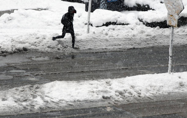 March 8, 2018 — A commuter makes their way to the Alewife MBTA station in Cambridge, MA during a nor’easter storm. (Photo by Joanne Rathe/The Boston Globe via Getty Images)