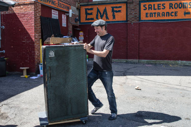 May 31, 2018 — Musician Charles Hansen moves an amp out of the studio space he rented at EMF as the roughly 200 musicians who utilized the building move out. The EMF artists were granted a reprieve from eviction earlier this year, but talks between the buildings owner, John DiGiovanni, and Cambridge officials about the city potentially managing the building as a creative space came to nothing. (Photo by Keith Bedford/The Boston Globe via Getty Images)