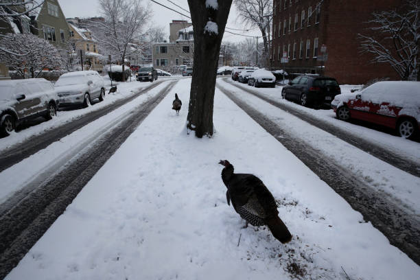 January 27, 2021— Wild turkeys gather on the median on Langdon Street. (Photo by Craig F. Walker/The Boston Globe via Getty Images)