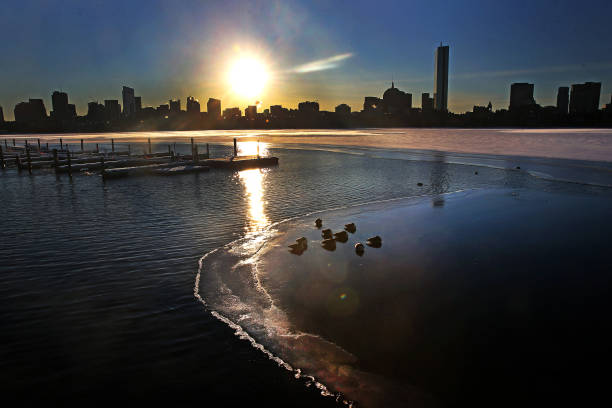 February 12, 2021 — Ducks seem to be frozen in place on an ice shelf in the early morning as the sun rises along the Charles River. (Photo by David L. Ryan/The Boston Globe via Getty Images)